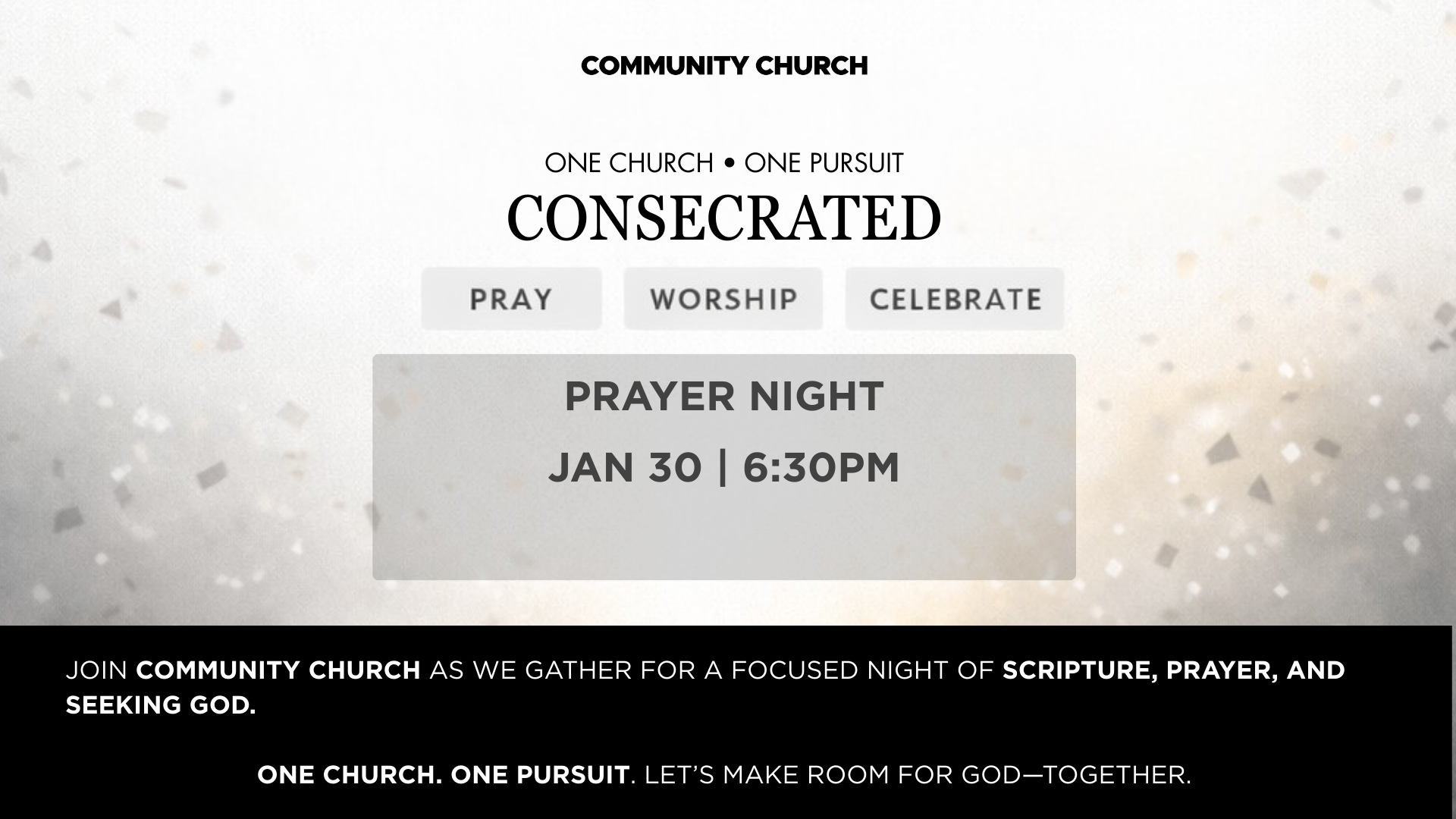 Prayer Night is a city-focused evening of prayer designed to help us seek God on behalf of San Jose while also covering the ministries of our church in prayer. You’ll move at your own pace through guided prayer stations that lead you to intercede for our leaders, neighborhoods, schools, and families, and to pray for clarity, unity, provision, and fruitfulness across the ministries of Community Church. Come for the whole experience or just part of it—our prayer is that God would bring peace, wisdom, and revival to our city and strengthen His Church for the mission.